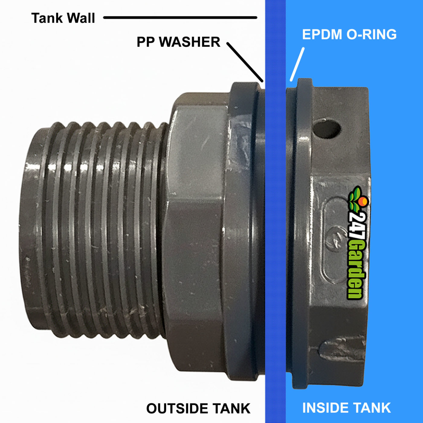 This completes the installation. The union design allows for easy disassembly and maintenance without removing the entire bulkhead from the tank. If you are looking for a schedule 80 PVC tank connectors, check out the 247Garden SCH80 with Union-Type Connection for easy installation!