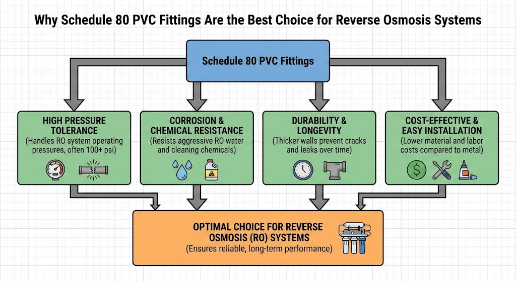 Schedule 80 PVC fittings play an important and reliable role in reverse osmosis (RO) systems, especially in commercial, agricultural, and industrial setups. Here’s how they fit in and why they’re commonly chosen: